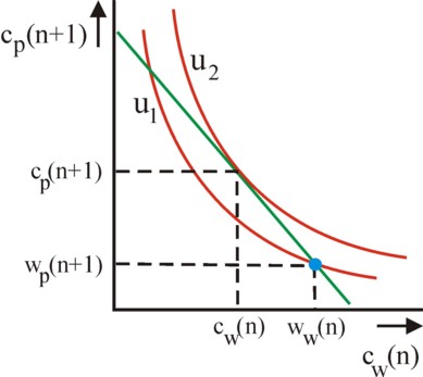 In the absence of savings the household h is in the point [wwh(n), wph(n+1)]. Since this is a point without any exchange, this is called an autarky9. Here the utility is Uh(wwh(n), wph(n+1)). The meaning of saving becomes clear, when the iso-utility curves of Uh = Uh(cwh(n), cph(n+1)) are considered, and these are also drawn in the figure 2. It is clear that the household h can increase its intertemporal utility by moving along the intertemporal budget line, until it is exactly tangent to an iso-utility curve. In that optimal point the intertemporal marginal substitution rate of cwh(n) and cph(n+1) satisfies10: