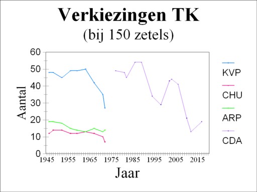 It has just been stated, that this tendency affects the christian morals. A consequence was, that the RC and PC became more willing to cooperate, notably in the political domain. In 1977 the ties are already so firm, that they participate in the election with a single christian-democratic party, namely the CDA. In 1981 the KVP, CHU and ARP are discontinued. However, this does not structurally end the decline. It can merely be slowed down temporarily, thanks to the exceptional talents of two christian politicians, Ruud Lubbers and Jan-Peter Balkenende. In 2017 the CDA represents merely 13% of all votes.